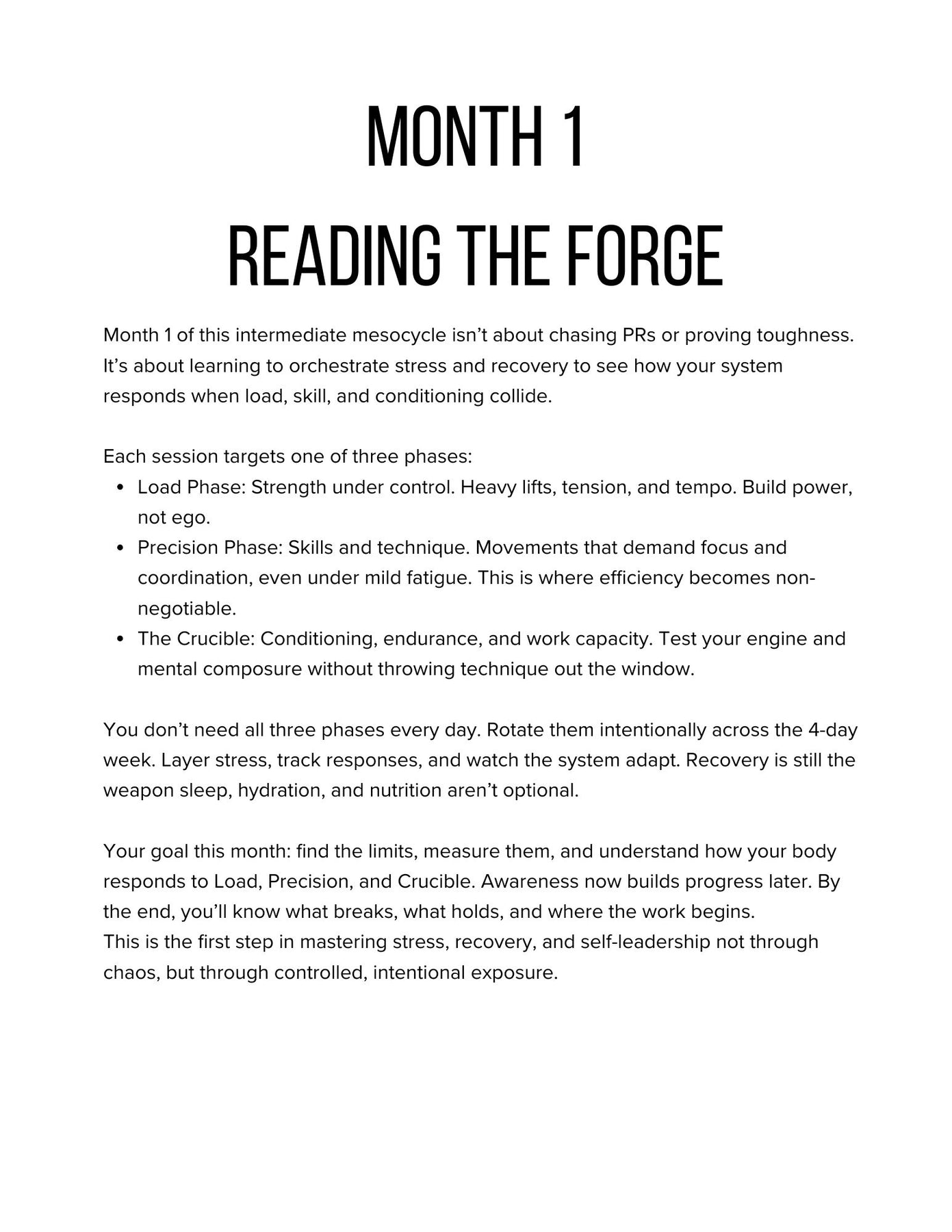 Inside, you’ll track, audit, and evolve strength, skill, conditioning, and mindset through a simple, repeatable 3-day cycle. No random workouts. No dopamine chasing. No “motivation hacks.”